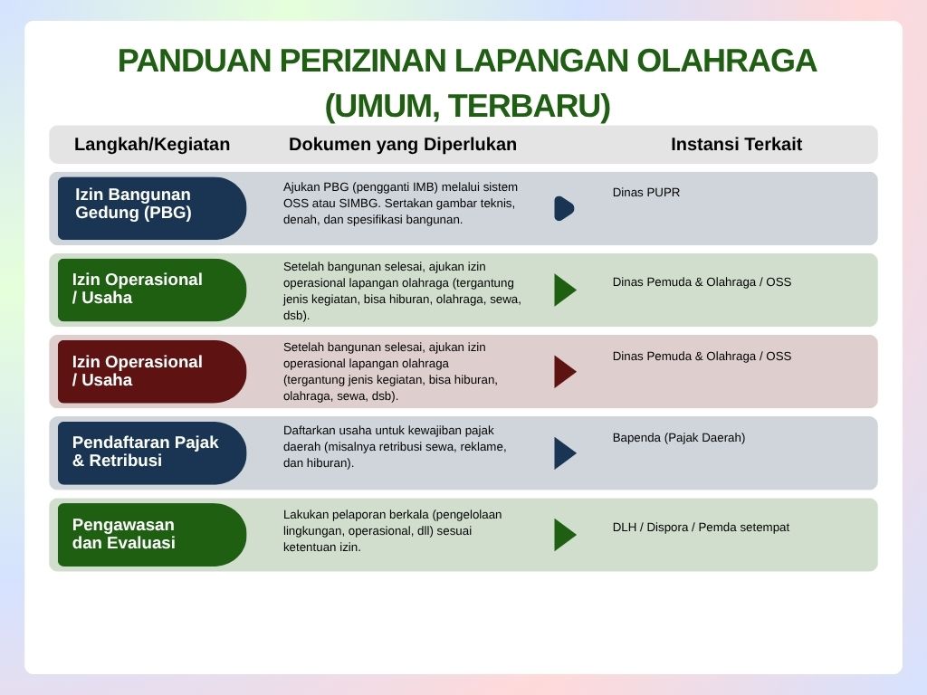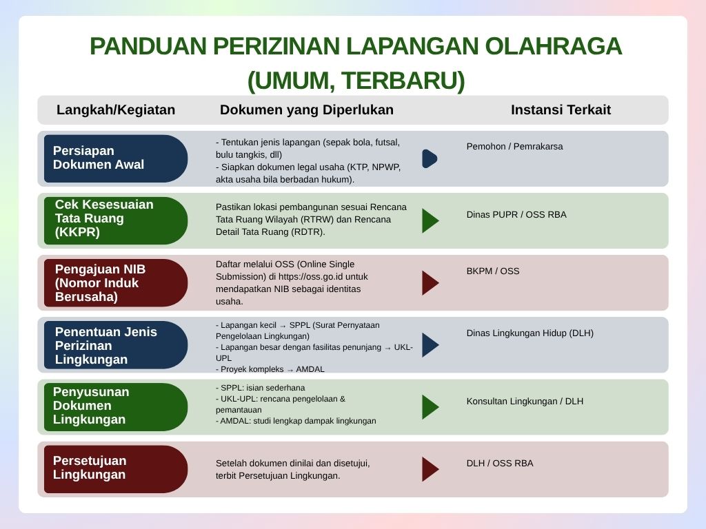 Pendirian lapangan olahraga termasuk dalam kategori pembangunan fasilitas umum. Karena itu, diperlukan sejumlah perizinan agar kegiatan pembangunan dan operasionalnya sah secara hukum.