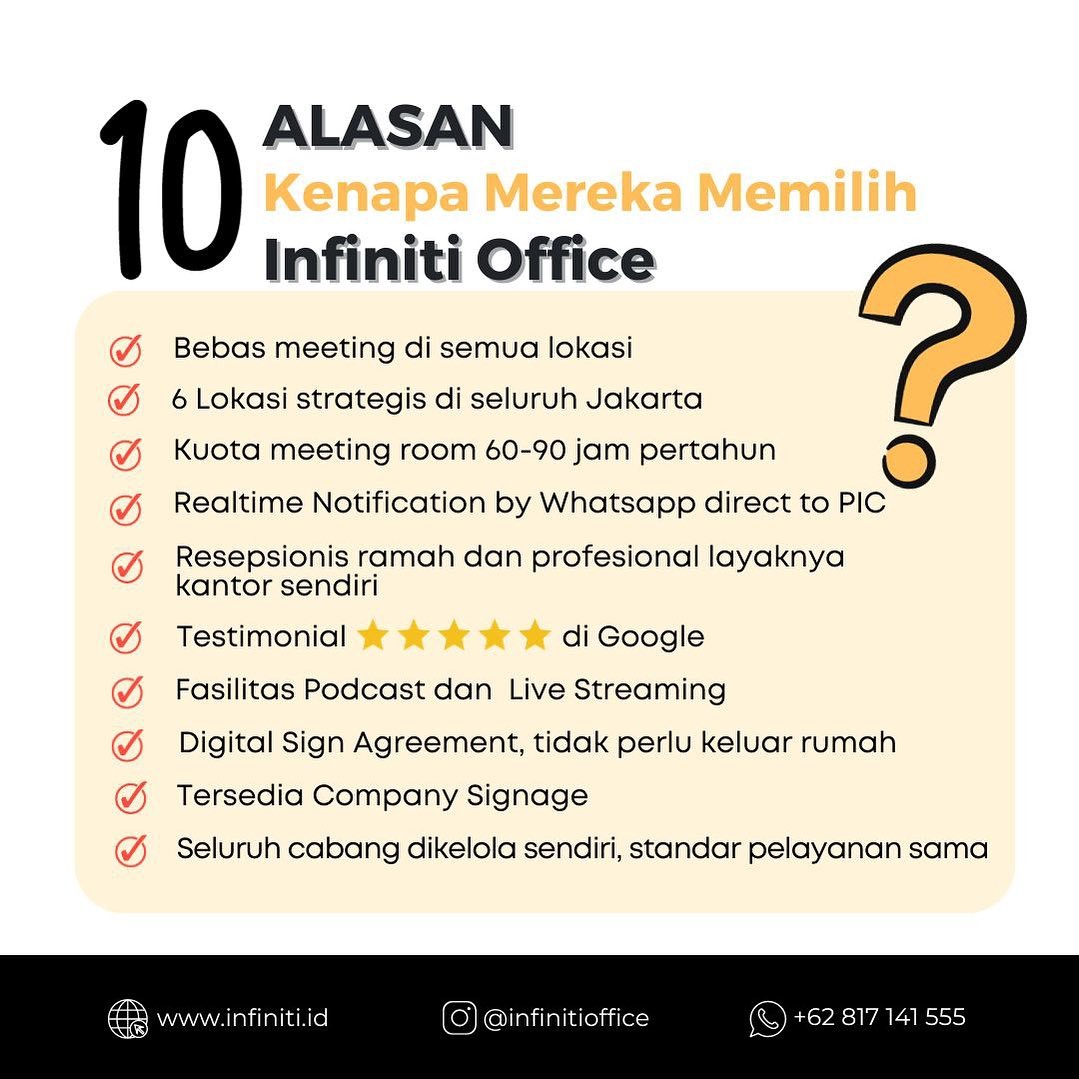Tidak heran jika semakin banyak pebisnis, freelancer, dan startup mempercayakan kebutuhan kantornya kepada Infiniti Office. Berikut 10 alasan kenapa mereka memilih Infiniti Office: