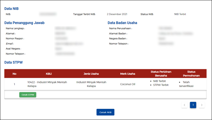 h. Jika Status Permohonan sudah menjadi Telah terverifikasi,maka Perizinan Berusaha (STPW) telah terbit. Selanjutnya Anda dapat melihat, mengunduh, dan mencetak produk perizinan berusaha tersebut dengan klik tombol Cetak STPW.