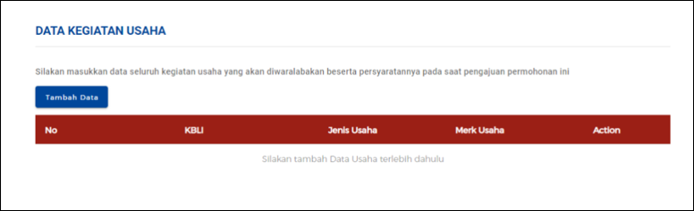 e. Lengkapi form Data Kegiatan Usaha. Klik tombol TAMBAH DATA, untuk menambahkan data seluruh kegiatan usaha yang akan diwaralabakan beserta persyaratannya pada saat pengajuan permohonan ini (Data ini bisa ditambahkan lebih dari 1 (satu) kegiatan usaha dalam 1 (satu) pengajuan permohonan sekaligus.)