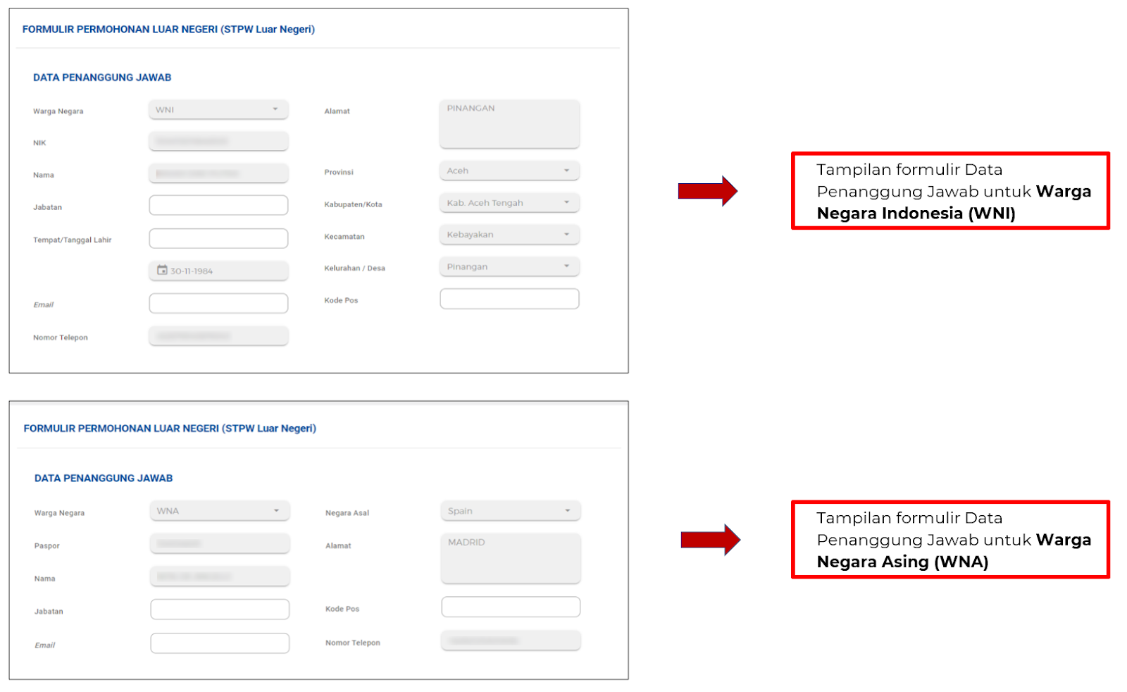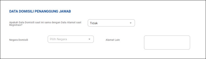 d. Lengkapi Form Data Domisil Penanggung Jawab. Jika anda mengisi Ya pada pertanyaan, Apakah Data Domisili saat ini sama dengan Data Alamat saat Registrasi? maka data Negara Domisili akan terisi otomatis dan tidak bisa diubah dan jika Anda memilih Negara Domisil Indonesia maka muncul isian data terkait Provinsi Domisili, Kabupaten/Kota Domisili, Kecamatan Domisili, Kelurahan/Desa Domisili.